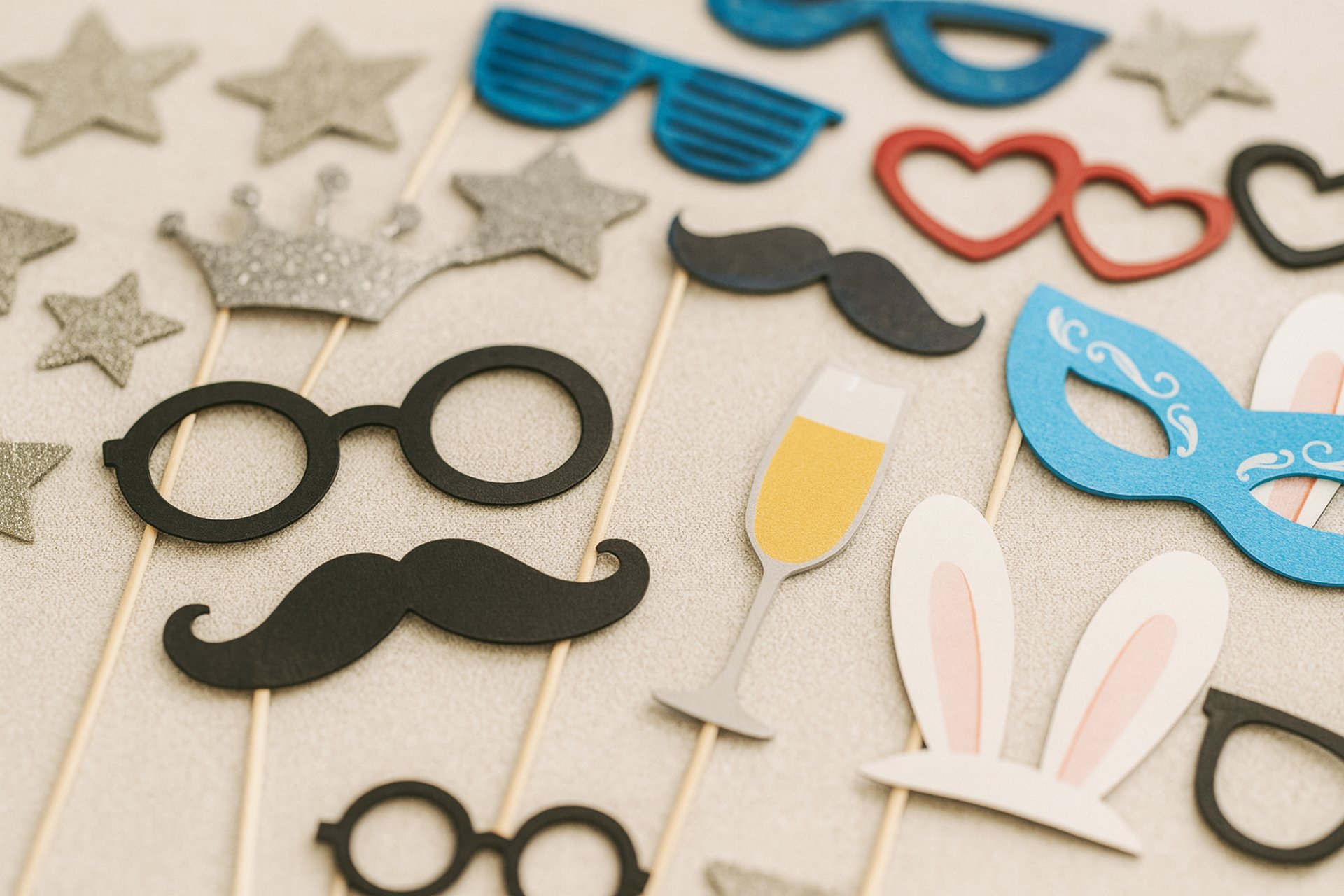 Bei jedem unserer Fotobox-Pakete geben wir eine große Box mit verschiedenen Requisiten, welche die Stimmung aufheitern und die Fotos auch nach dem Event unvergesslich machen. Die Box enthält alles von witzige Brillen und kreativen Schildern bis hin zu ausgefallenen Hüten und weiteren Accessoires. So entstehen beste Stimmung bei Ihren Gästen und unvergessliche Erinnerungen - egal ob Hochzeit, Geburtstag oder Firmenfeier!